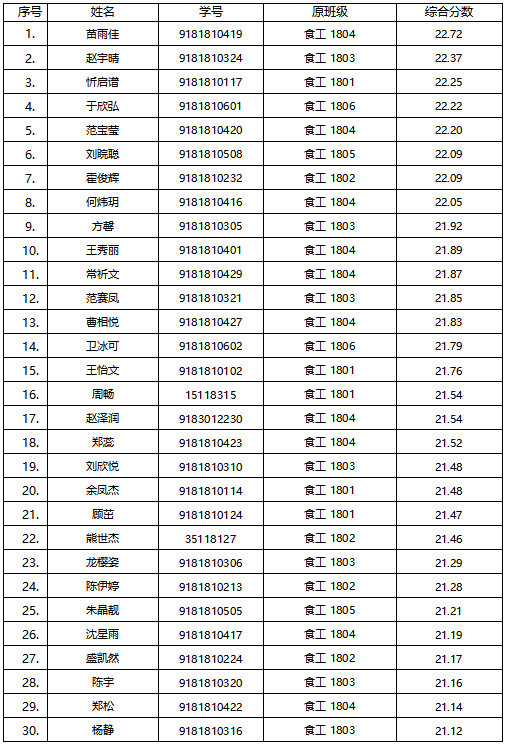 2018 级大类招生专业分流实施办法》,经相应的考核程序,拟录取 30 名同学入选 2018 级“复合应用型” 食品科学与工程(卓越班),现将名单予以公示。