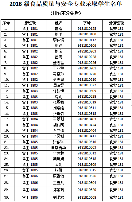 依据《偷情 2018级本科大类招生专业分流实施方案》和《偷情 2018级本科大类招生专业分流工作计划》,学院开展了2018级食品科学与工程大类专业分流工作,各专业录取人数如下:食品科学与工程专业录取90人、生物工程专业录取33人、食品质量与安全专业录取60人,现将录取学生名单予以公示,详细名单见附件。