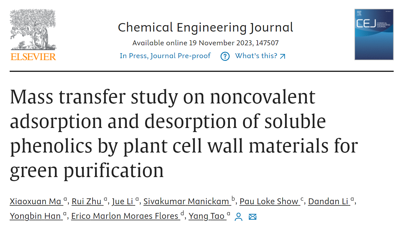 2023年11月,食品学院韩永斌、陶阳课题组在国际期刊Chemical Engineering Journal发表题为“Mass transfer study on noncovalent adsorption and desorption of soluble phenolics by plant cell wall materials for green purification”的研究性论文。揭示了植物细胞壁材料非共价吸附/解离可溶性多酚的物理传质新机制,开发了可溶性多酚绿色纯化新技术。
