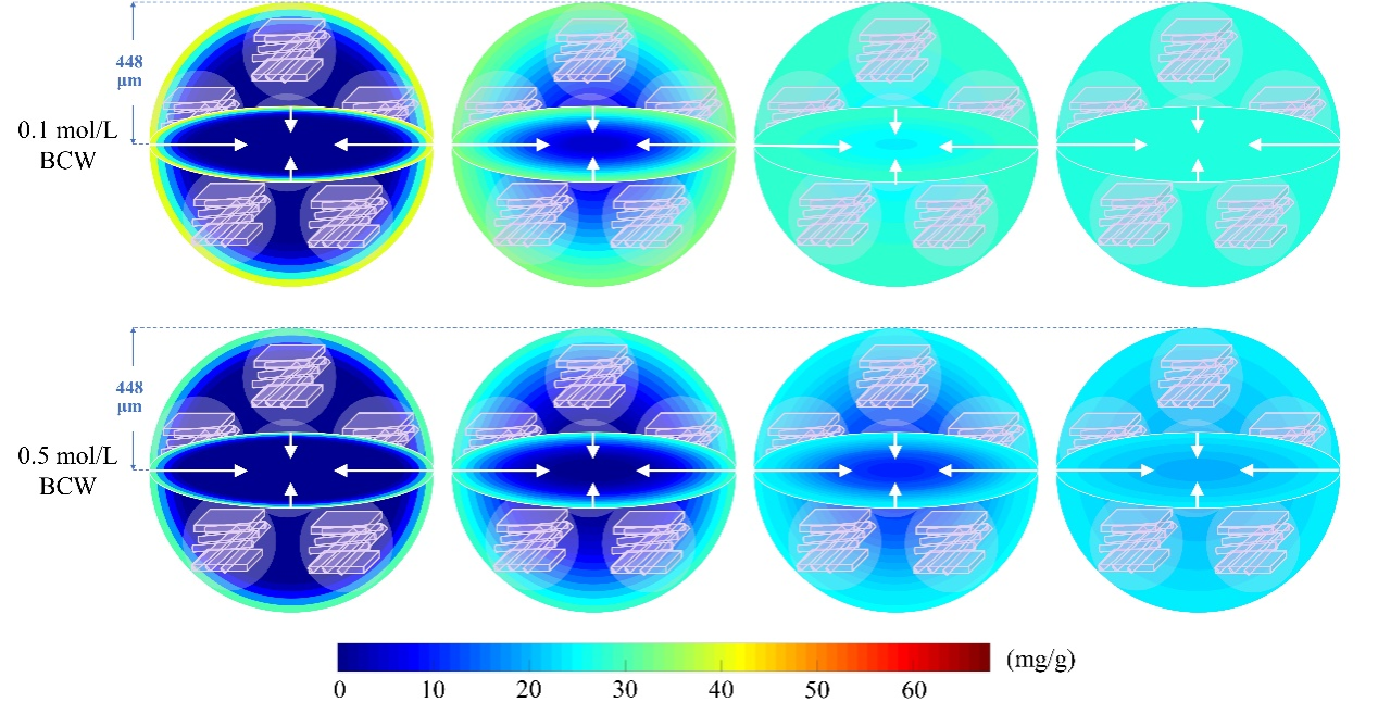 (箭头表示植物细胞壁吸附的传质方向;圆圈内图案代表植物细胞壁结构;CCW为芹菜细胞壁材料;BCW为蓝莓细胞壁材料)